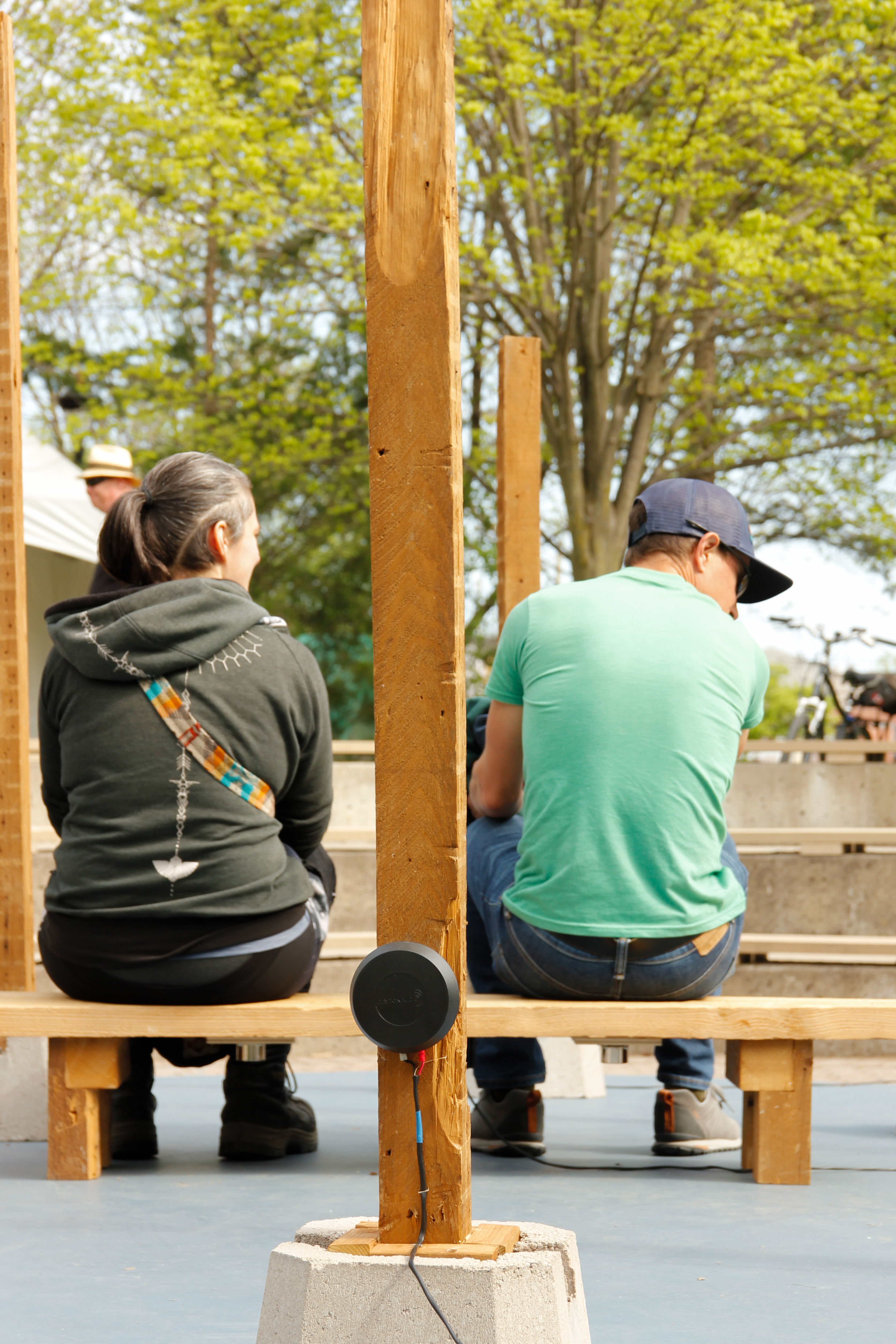 Un jardin, un champ, des matériaux, des fleurs de chantiers, qui nous entourent, un repos, un mur, un centre, sifflements, du vent, doux, puissant, fortuit, gracieux, intangible. Un banc. Quelques places au milieu des chants d’éoles, quelquefois capturés, quelquefois cultivés. Enregistrements, synthèses, traitements, vibrations, Grain blanc, Chinook, capteurs, Nordet, Suroît, transducteurs, Lorenz, substrat des sens, espace sonore, sublime, chaos, pause.